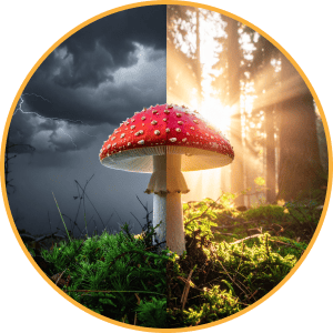 The story of Amanita Muscaria begins with the trees. This mushroom shares a timeless connection with pine and birch, weaving its life into the roots and soil in a bond called mycorrhizal symbiosis. It cannot be grown in fields or factories — it only flourishes where the forest creates the perfect conditions.