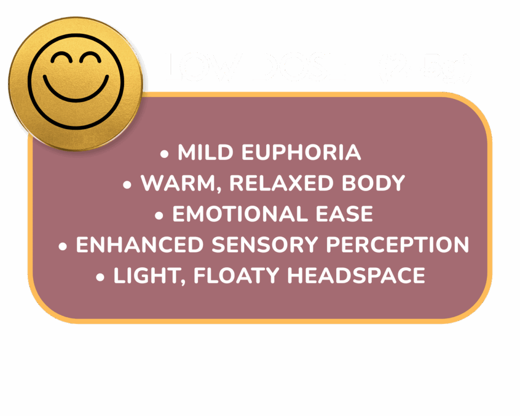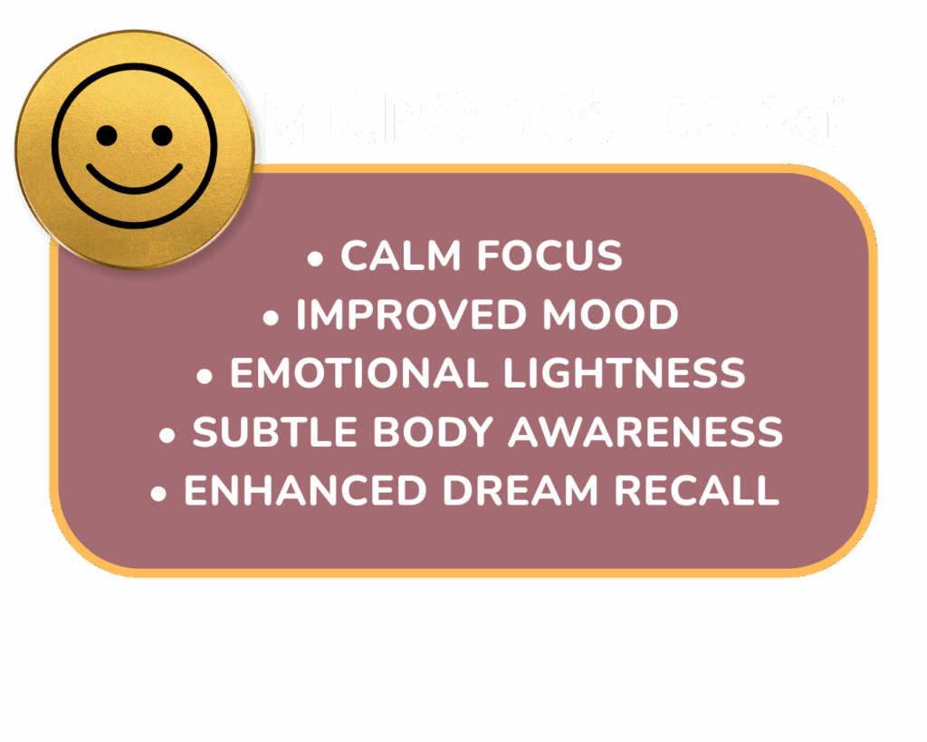 If you’re looking to explore microdosing, start with 0.5-1 gram, 2-3 times per day. Pay attention to your thoughts and how your reality shifts over time. Stay consistent for 2-3 weeks to feel the full effects.
