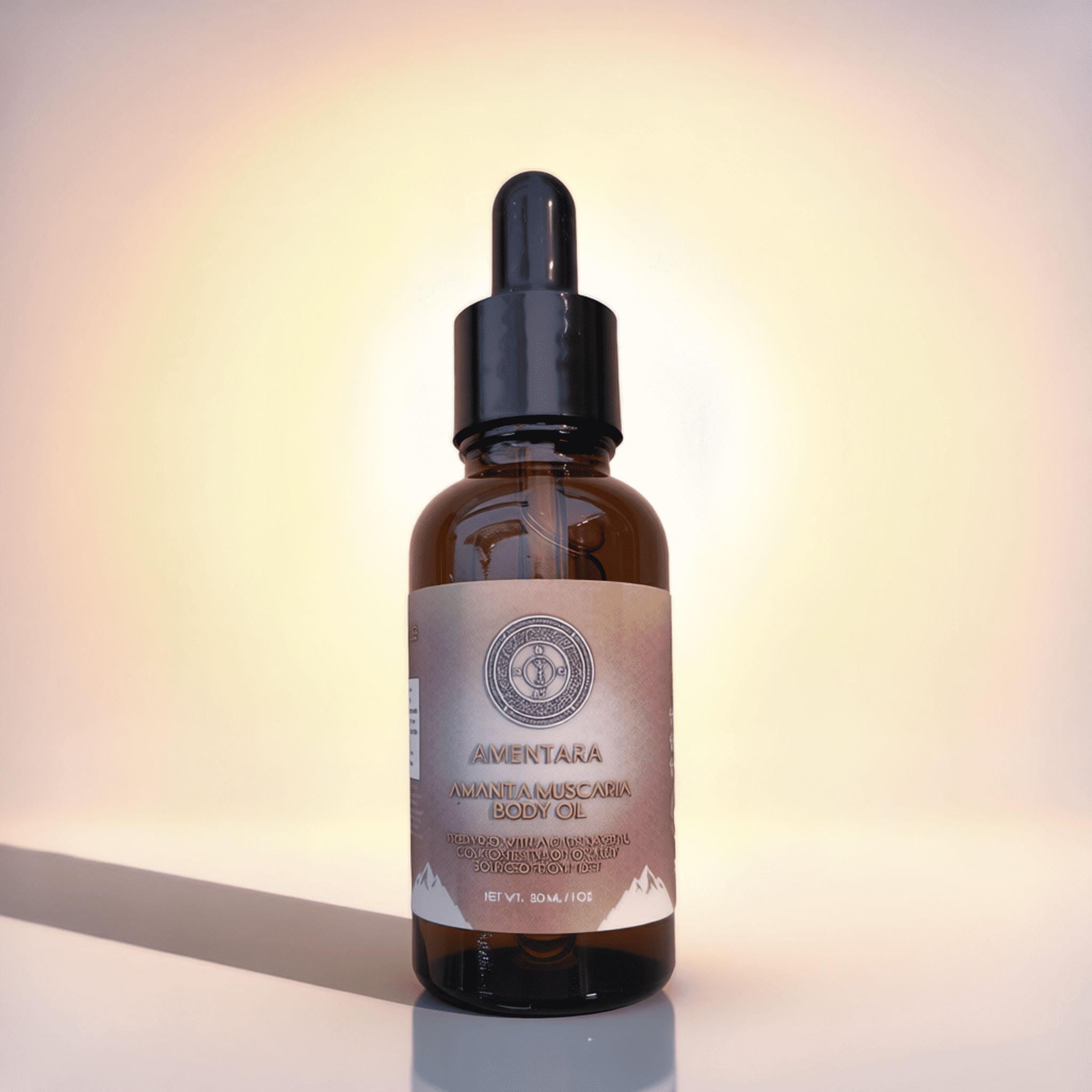 Our Amanita Body Oil is a slow-crafted topical infusion made with 10 grams of Amanita mushroom per bottle, gently extracted into 30 ml of organic castor oil over time to preserve the full energetic and somatic profile of the plant.